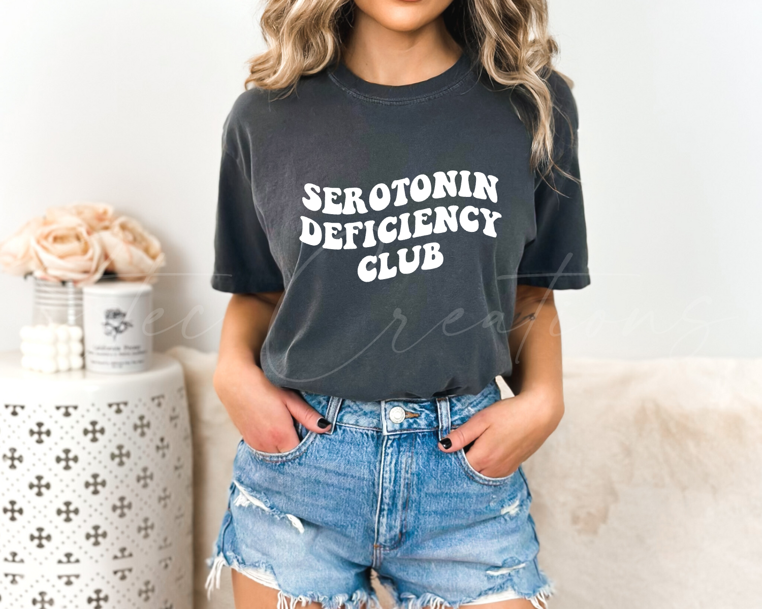 The Serotonin Deficiency Club unisex t-shirt is crafted from 100% Cotton and is designed to keep you comfortable and stylish. The Comfort Colours brand ensures you a more natural fit and a variety of colours to choose from, including the Pepper tone shown in the product image.
