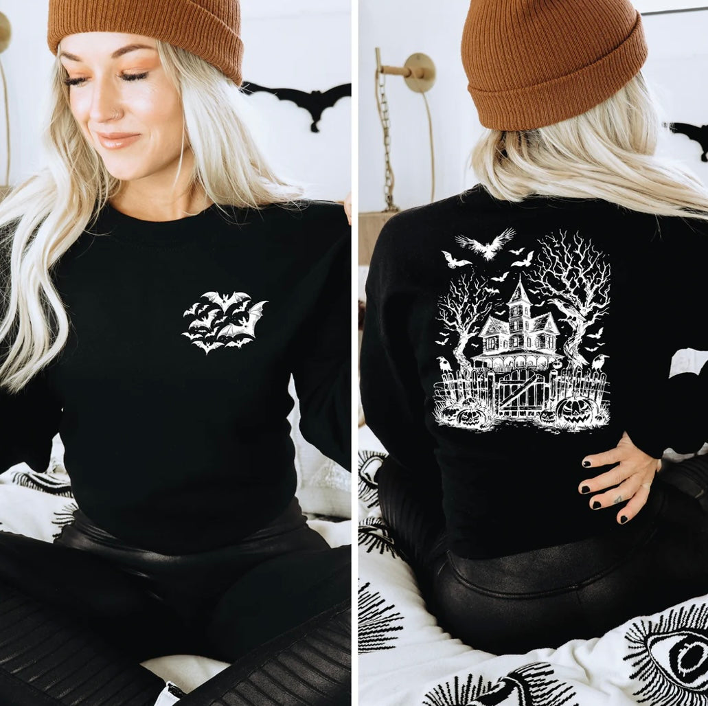 🏚️🦇 Get ready to haunt the streets with our spooky design featuring a chilling haunted house on the back and eerie bats on the front! 🎃✨ Perfect for those who love a good scare, this tee will make you the star of any Halloween gathering. Don’t let this ghostly style fly away—grab yours today! 🖤👻